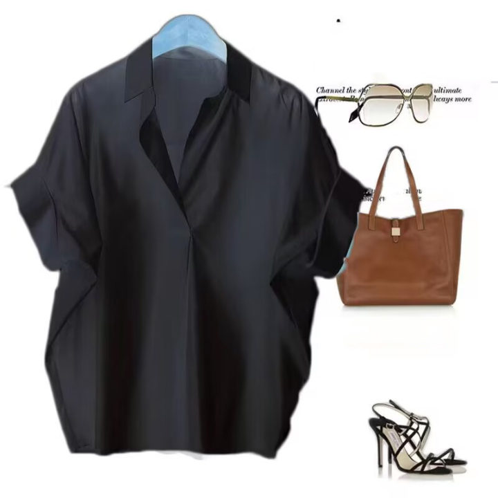 おしゃれ、シンプル、デザイン、ちょっと贅沢、クラシック、怠惰で万能、軽くて大人、バットスリーブ、無地Vネックシャツ