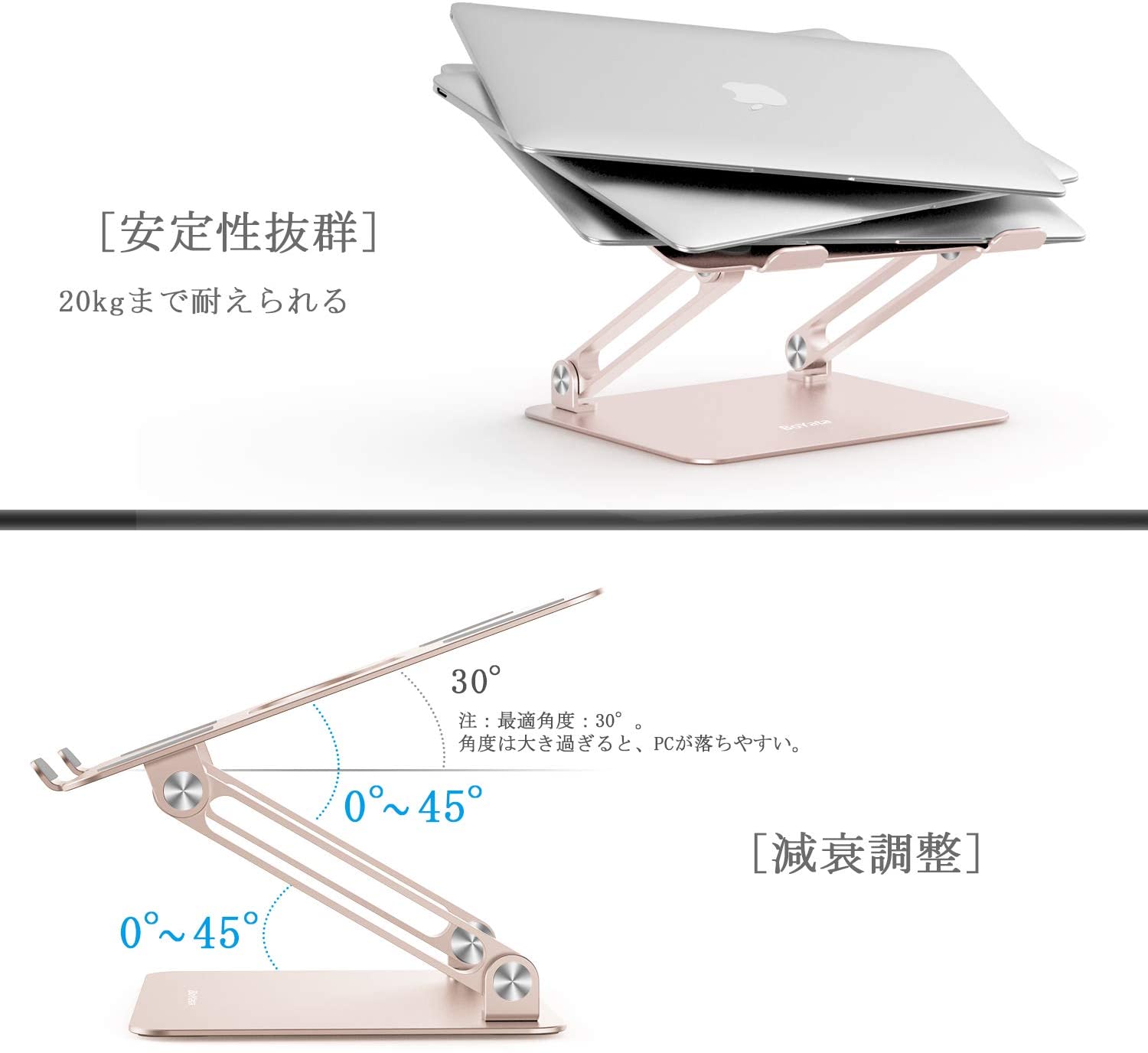 - 【安定感抜群・耐重20kg】●Boyata PCスタンドの角度調節は多少力がいりますが、成人女性でも問題ない程度です。逆に、調節に力が必要な分しっかりしているので、使用中に下がってくるようなことは無い、頑丈で安定しています。●安心の両足構造で傾きがなく、安定性が抜群で、20kgまで耐えられます。
