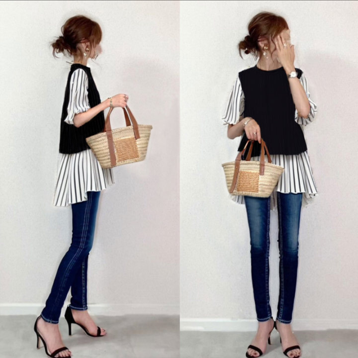 ブラウス tシャツ 切替 夏 レディース トップス 半袖 フェイク2点 フォーマル 着痩せ チュニック ミドル丈 黒白 上品可愛い フレア アジアン