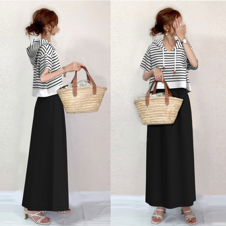 ボーダー 半袖 フード付きパーカー+ ハイウエスト ストレート 無地スカートセットアップ