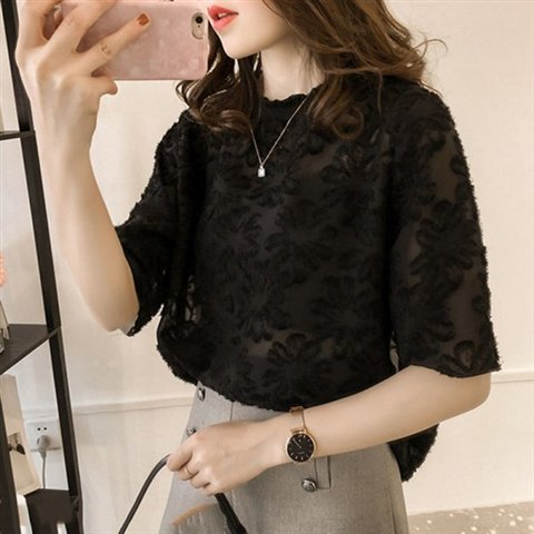 ミッドスリーブ クルーネック フローラル ジャカード フレイド シアー シャツ