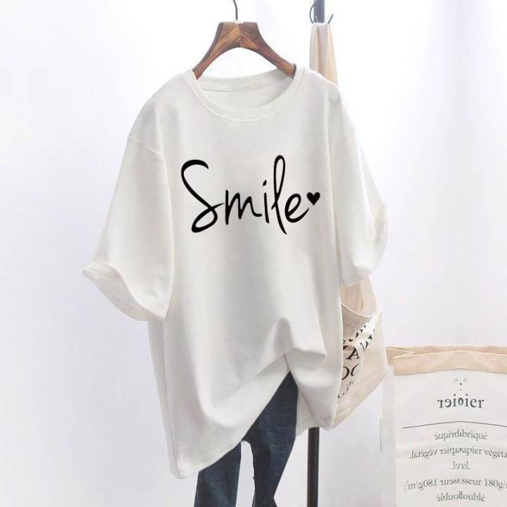 レディース プリント、フォント クルーネック コットン ブレンド ホワイト T シャツ