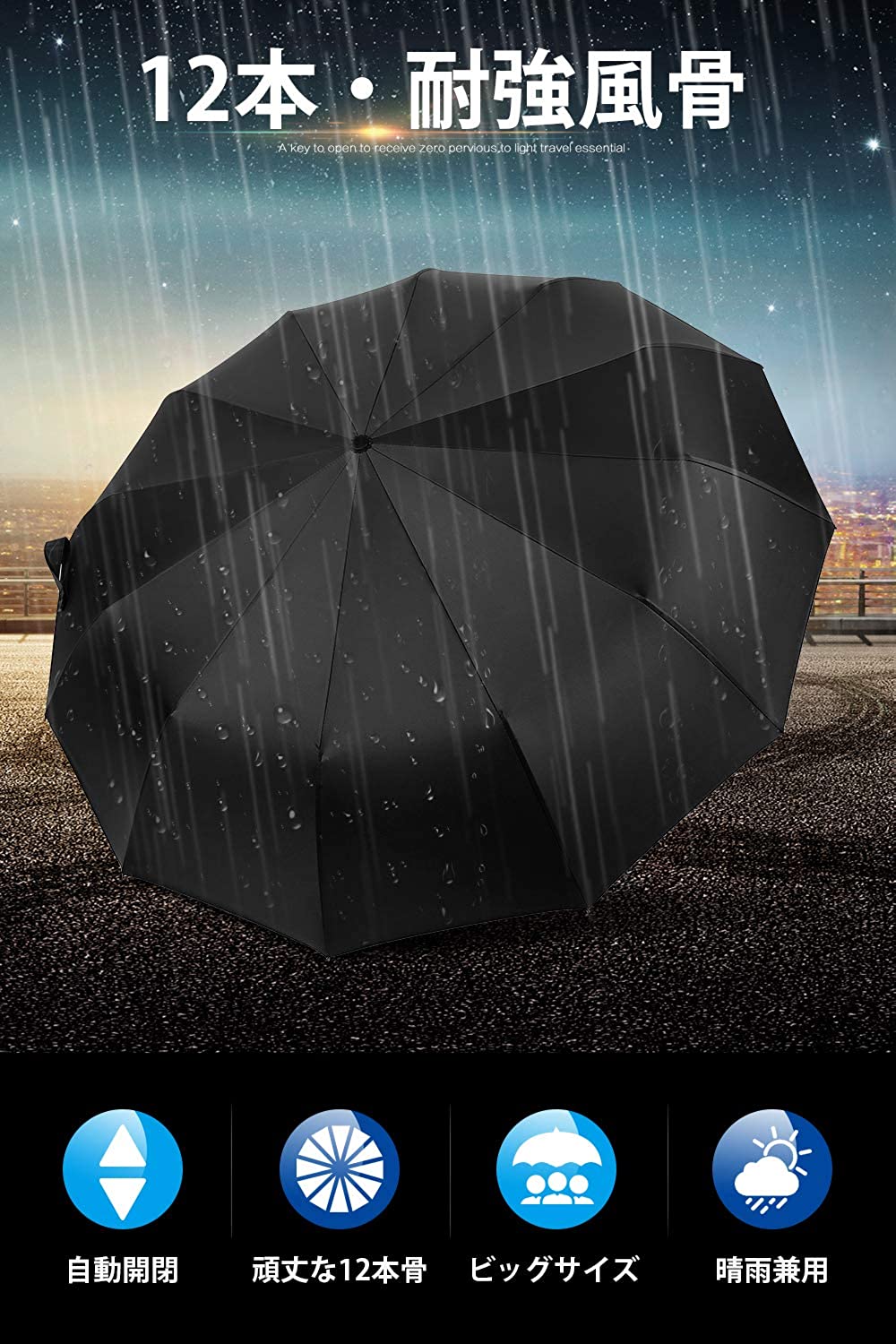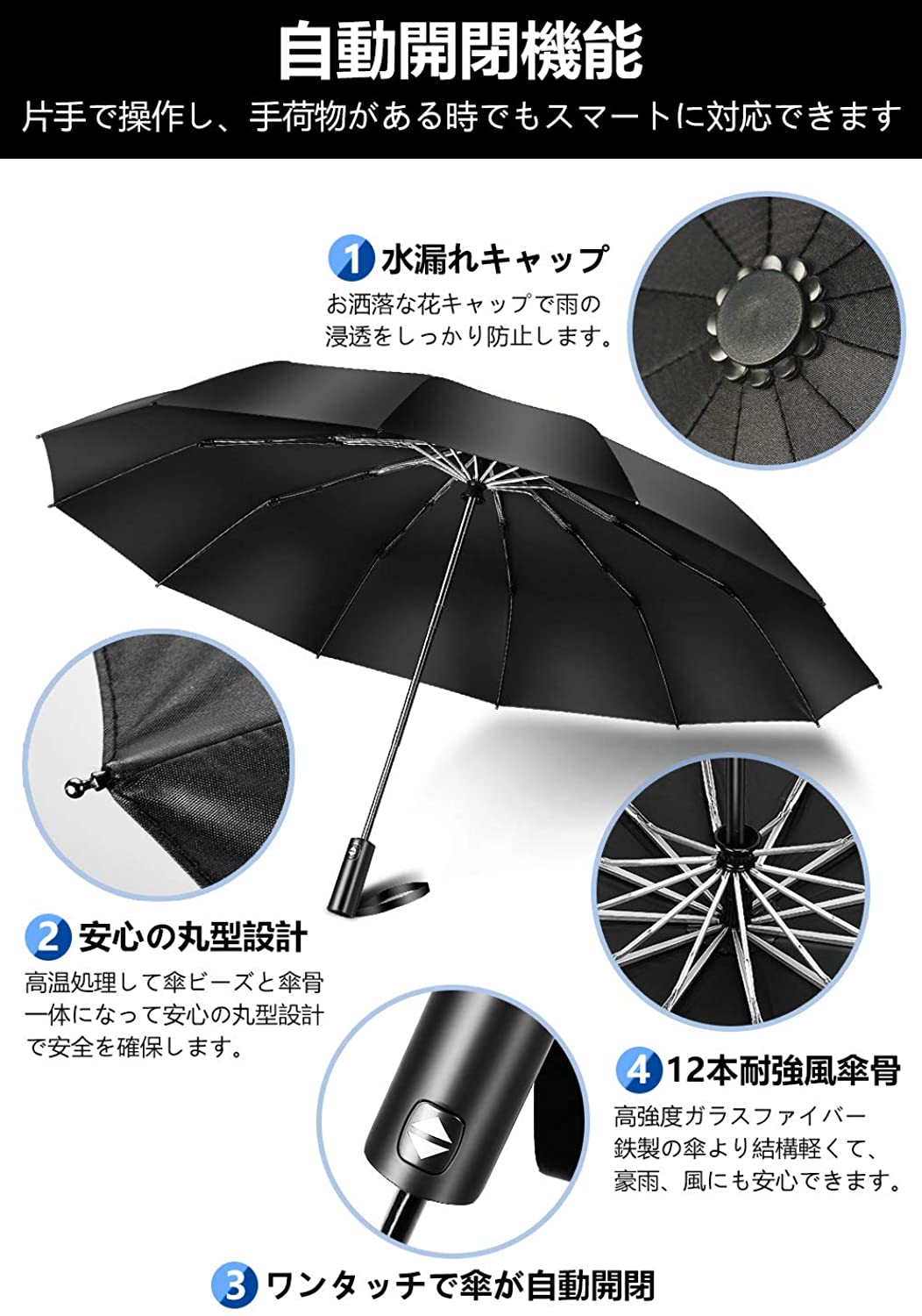 - ☂【自動開閉&強風対策】軽く押すと自動開閉できます。車を降りたり、子供を抱いたり、荷物を持っている時、折り畳み傘は最適です。空気力学に基づいて風を受け流す構造で設計されているので、強い風でびっくり返っても元に戻ります。二人で荷物を持って傘に入っても余裕があるほどの大きさですので。梅雨はもちろん、豪雨、強風にも安心できまる12本骨おりたたみ傘です。
