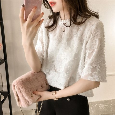 韓国スタイルの女性のトップス美しくエレガントなレースラウンドネック花刺繍トップス半袖スリムファッション大人 Tシャツ夏